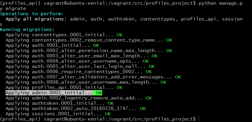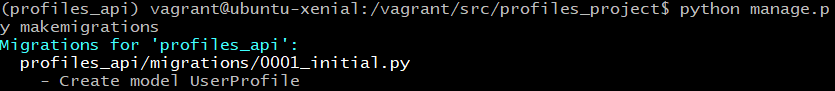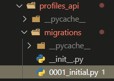 - Create model UserProfile 확인앱 내에 migrations 폴더와 지금까지 우리가 만든 변경 사항을 담은 첫 마이그레이션 파일이 생긴다. 마이그레이션 파일은 장고에게 어떻게 우리의 데이터베이스를 설정할 것인지 알려주는 역할을 한다.