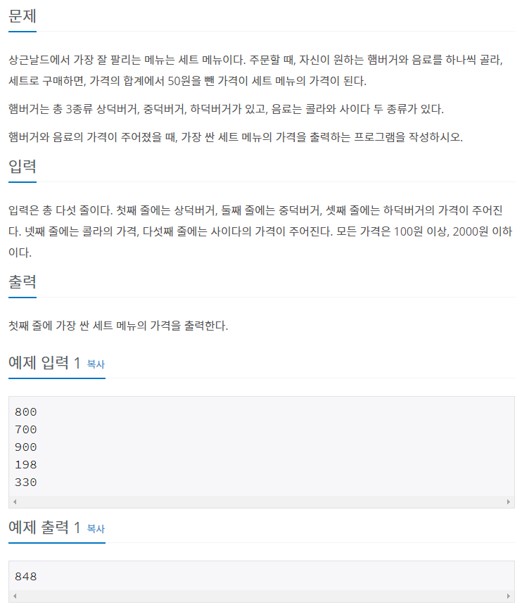 print(min(burger) + min(drink) - 50)