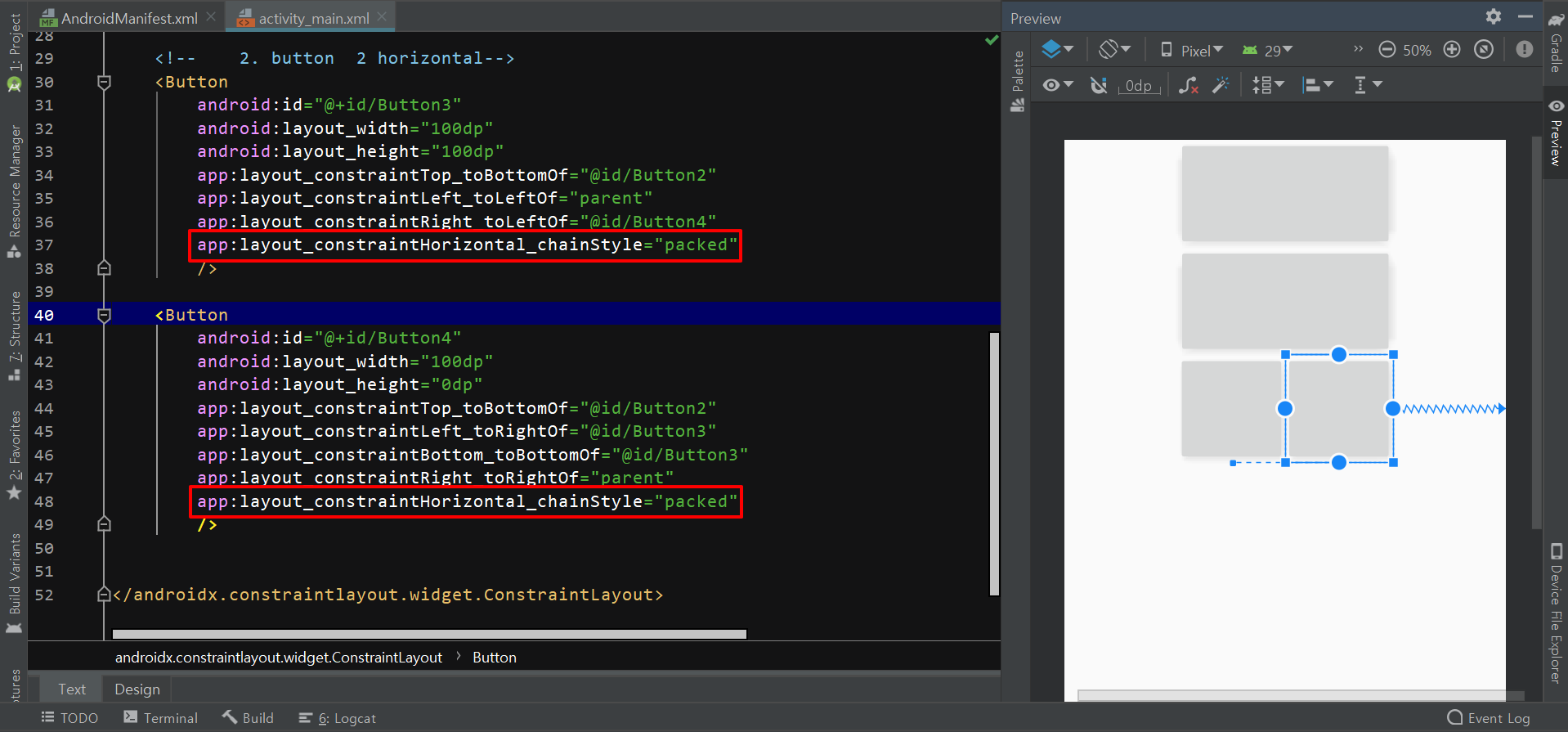 서로 제약받는 상태로 설정 하면 -> constraintHorizontal_chainStyle = "spread"인 상태